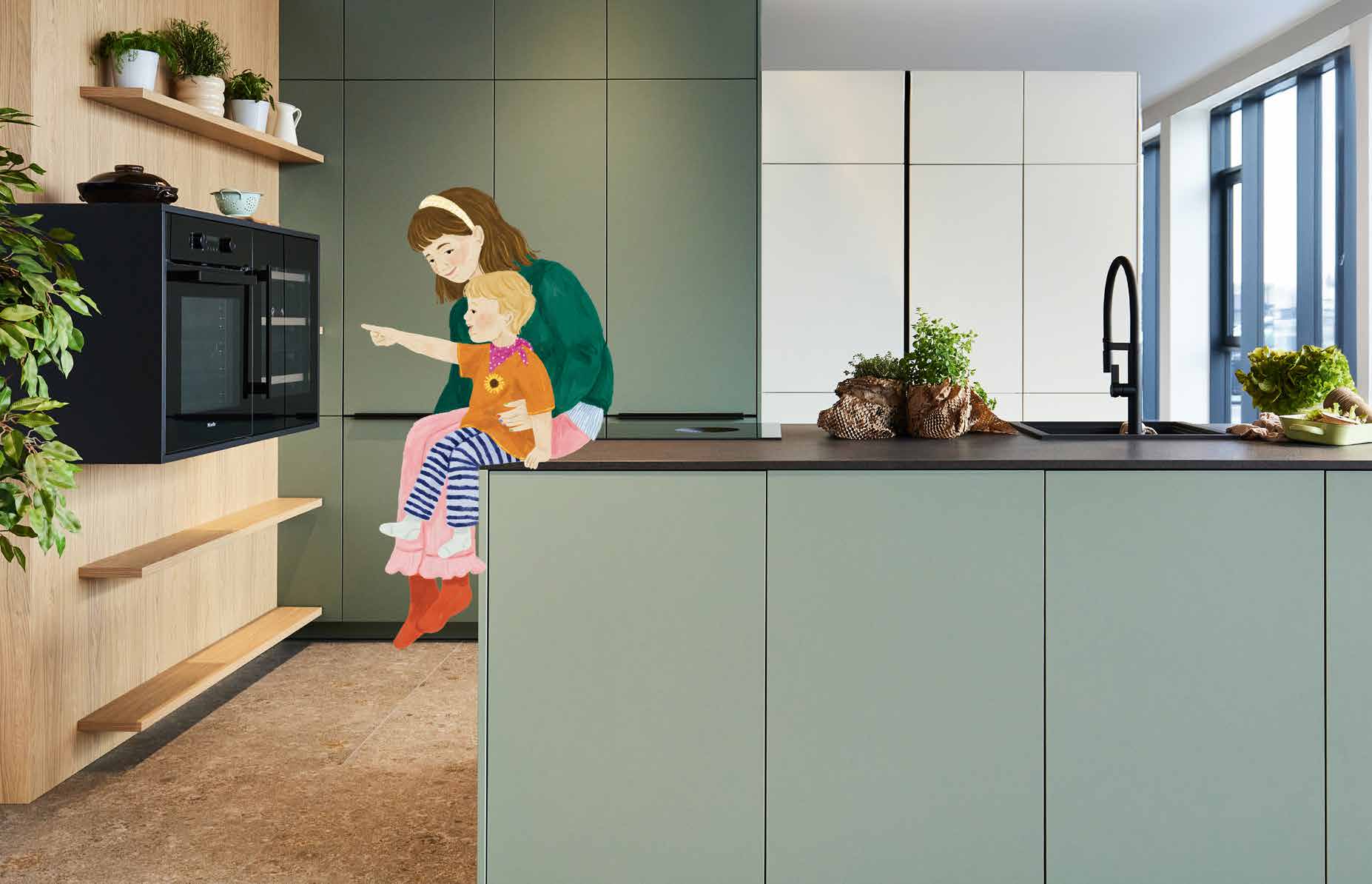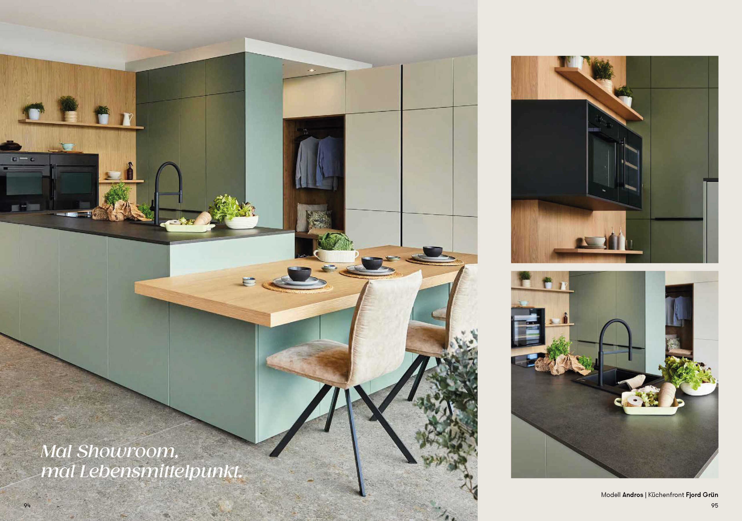 Ein besonderes Statement setzt die Kombination aus Fjord Grün und einer anthrazitfarbenen Arbeitsplatte: frisch, modern und voller Tiefe. Der sanfte Grünton bringt Leben und Leichtigkeit in den Raum, während das dunkle Anthrazit eine elegante Basis bildet. Ideal für alle, die mutige Farbakzente lieben.